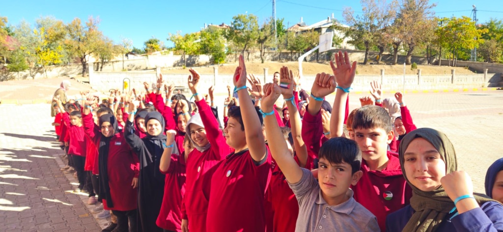 Türkiye Yüzyılı Maarif Modeli temel hak ve hürriyetler perspektifinde koşulsuz insan haklarına saygı, küresel barış ve dünyaya saygı ilkelerini merkeze konumlandırır. Bu yüksek kurumsal ve ahlaki sorumluluk bilinci doğrultusunda, okulumuzda Filistin/Gazze'de yaşayan tüm çocuklar için farkındalık etkinlikleri gerçekleştirilmiştir. Bu etkinliklerle, Filistin'deki insan hakları ihlallerinin sona erdirilmesine yönelik kararlı desteğimizi somut biçimde göstermek ve çocuklarımızın insan hakları ile demokratik duyarlılığını, ortak sorumluluk bilincini en üst düzeyde pekiştirmek amaçlanmaktadır. Bu etkinliklerin, öğrencilerde insan hakları savunuculuğu bilincinin köklü biçimde inşasına zemin hazırlayacağı değerlendirilmektedir.